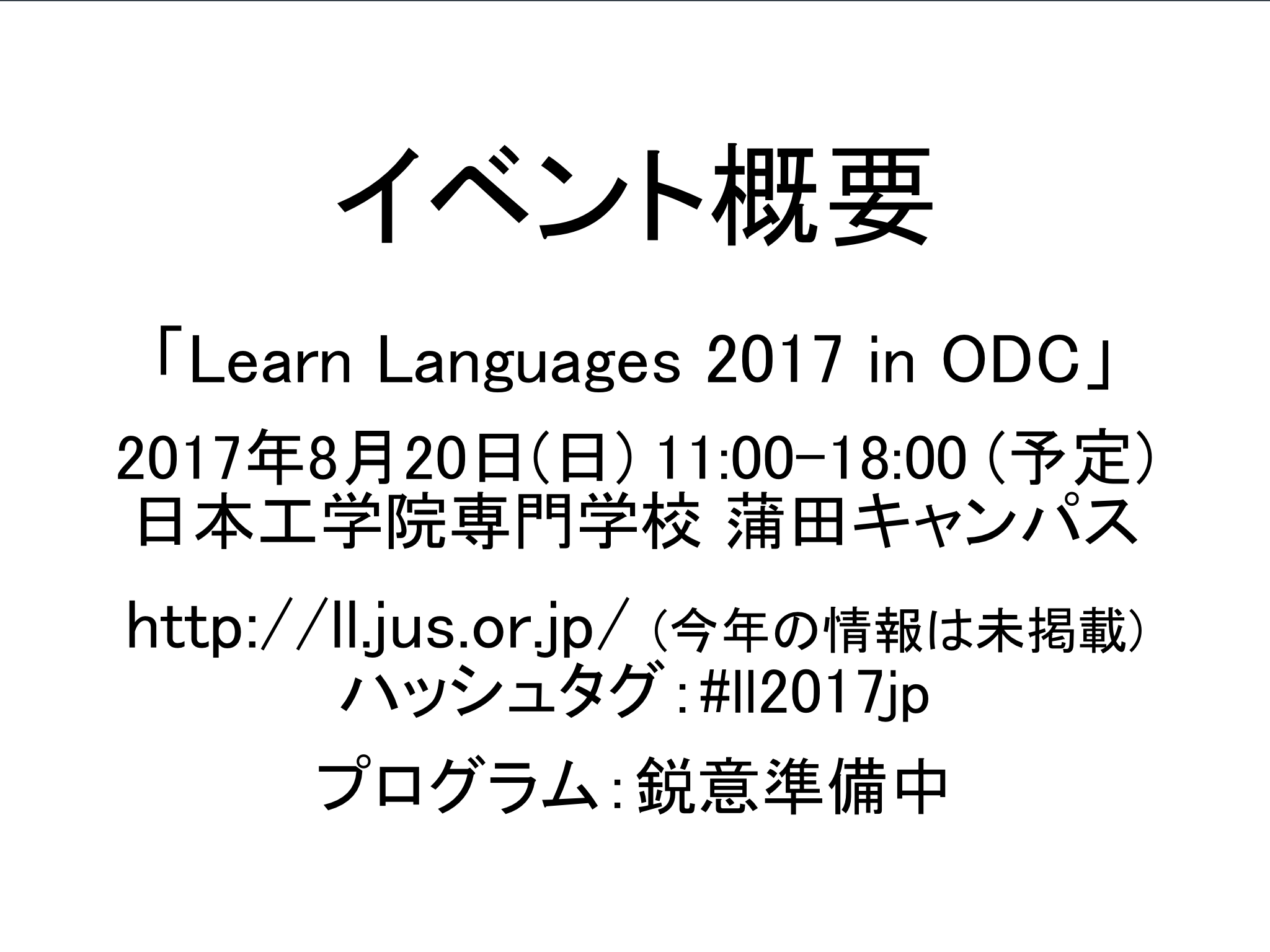 現在、プログラムの企画および登壇者の交渉を行っているところです。開催1か月前にあたる7月20日前後に公開できるよう進めていますので、しばらくお待ちください。追加情報は、LLイベントのウェブサイトやブログ、SNSなどをフォローしてください。